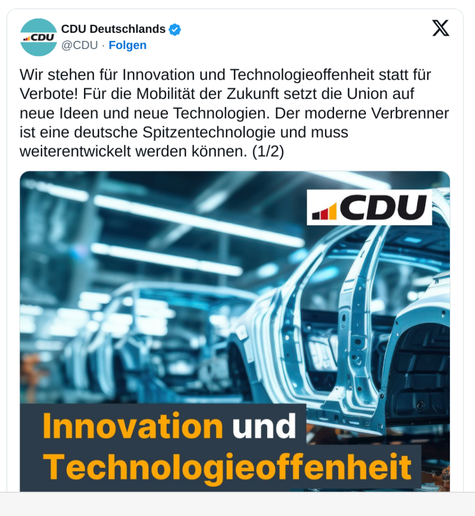 Das ist die CDU. Ungeschminkt. Kein Fake, alles echt. Sie hat ihre Mitglieder gefragt, ob sie vom „Verbrenner-Aus“ zurück wollen. Also einem EU-Gesetz, das unter dem CDU-Vorsitz entstanden ist. Übrigens wird da nicht der Betrieb bestehender Verbrenner verboten, sondern die Zulassung neuer Fahrzeuge, die nicht CO²-neutral sind, ab 1935, also in 11 Jahren. Es ist auch so schon zu viel Treibhaus-Gas in der Atmosphäre; da ist das wohl folgerichtig.